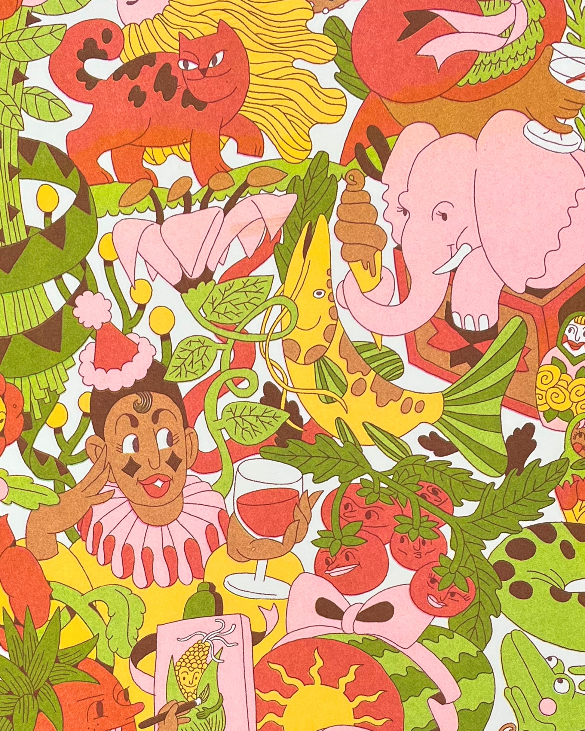 I Risograph printed these while an artist-in-residence at Directangle Press in New Hampshire. The cover print features fluorescent pink, yellow, kelly green, and mahogany inks.