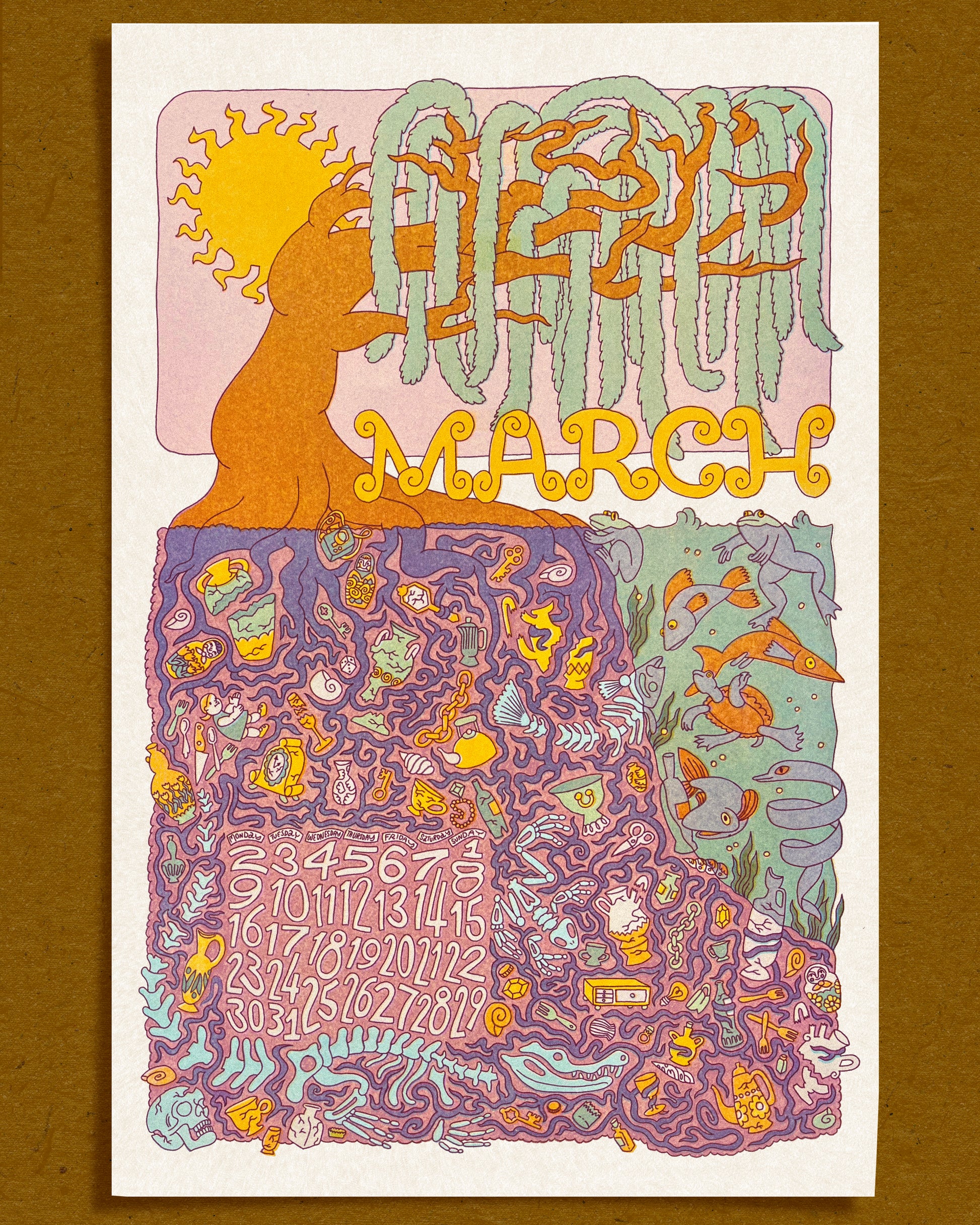 These are prints from my 2026 Risograph Calendar that are perfectly good, but I couldn't use them to make more calendars because I ran out of the other months!